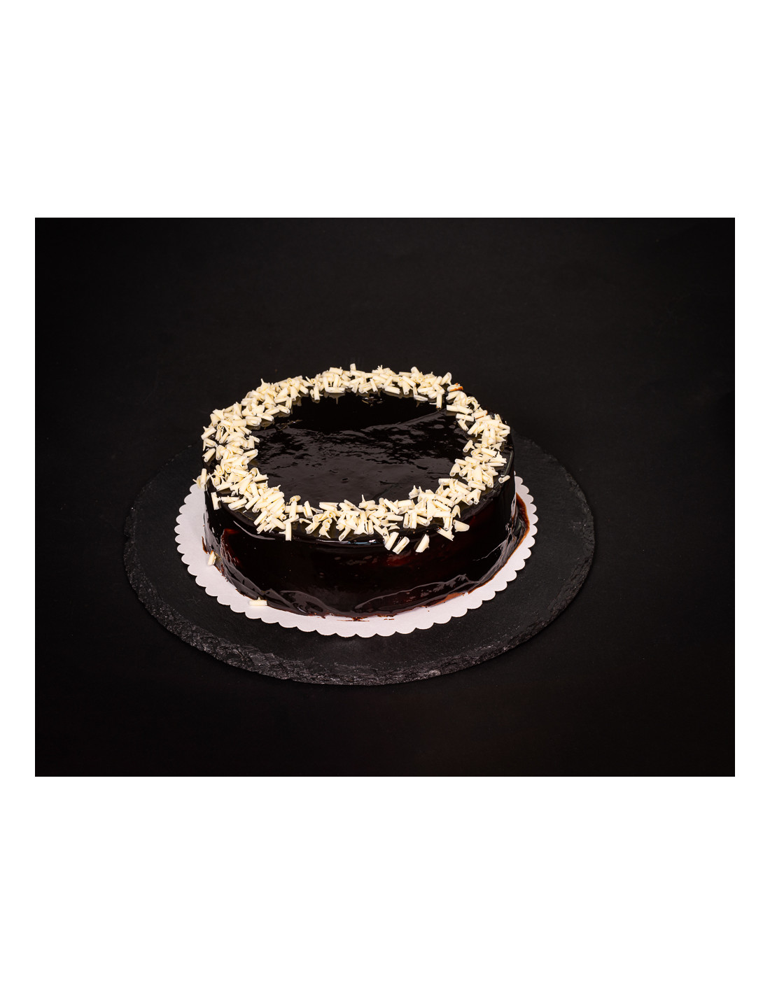čokoládový korpus, čokoládová ganáž, čokoládová lesklá poleva, čokoládové hobliny bílé
